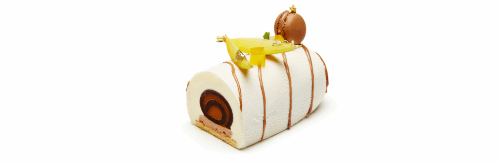 Un tronco exquisito: bizcocho de chocolate, mousse de mascarpone y la frescura del mango en cada bocado.